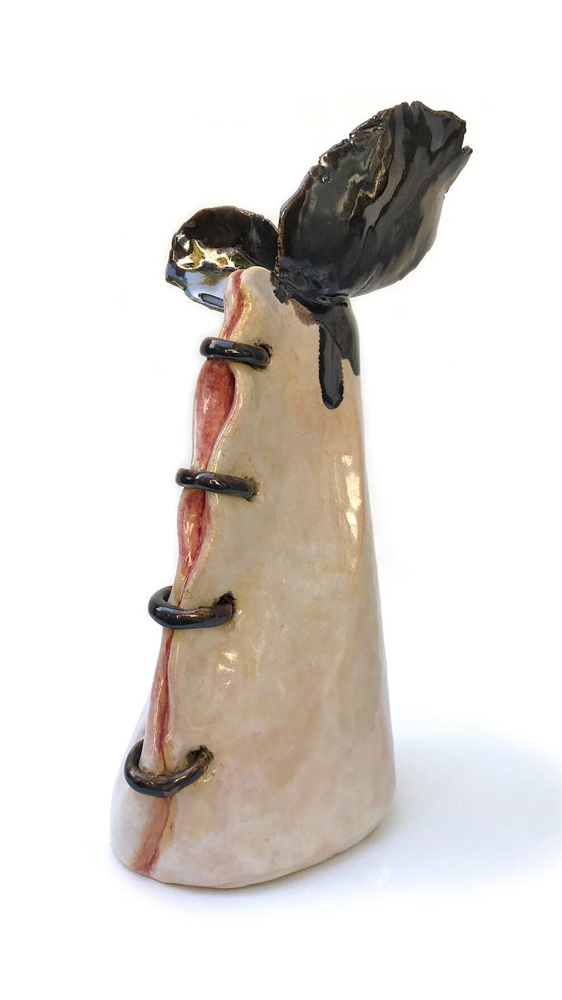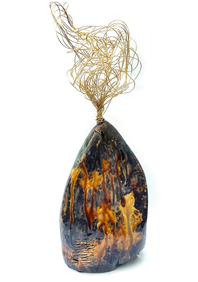 De beelden voor deze expositie zijn gebaseerd op gedachten over lichaam, ziel/geest en identiteit. Binnen het thema van deze tentoonstelling schijnt het licht op de vraag “wie is die ‘ik’ die in dit huis van huid, haar, botten en stemmingen woont?” De beelden bestaan uit twee delen: het vat of lichaam en dat wat er in woont. Ik noem het ‘zwerfscherf’. Iets vloeiends en levengevend. Erover nadenken is genoeg. Een antwoord mag uitblijven.