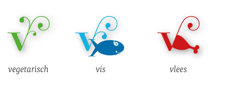 Voor de aanduidingen Vegetarisch, Vis en Vlees maakte ik heldere icoontjes die gebaseerd zijn op het lettertype (Winslow Title) dat ik koos voor de titels.