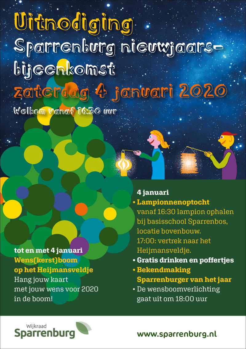 Uitnodiging voor wijkbewoners voor de nieuwjaarsbijeenkomst. Dit jaar staat er een wens-kerst-boom in de wijk. Bewoners kunnen daarin een kaart hangen met daarop hun wens voor het nieuwe jaar.