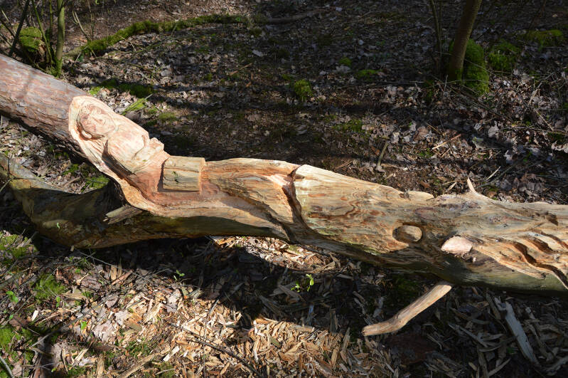 Dit beeld is helaas niet meer te vinden in het bos. De boomstam lag over een pad en enkele fanatieke mensen meenden dat de paden vrijgemaakt moesten worden. Ze hebben een heel aantal omgevallen bomen in stukken gezaagd, waaronder dit fraaie exemplaar. Ik vind het ongelooflijk. Het is een daad van vandalisme en kortzichtigheid. Er was bovendien al lang een nieuw pad, om de omgevallen boomstam heen, ontstaan.