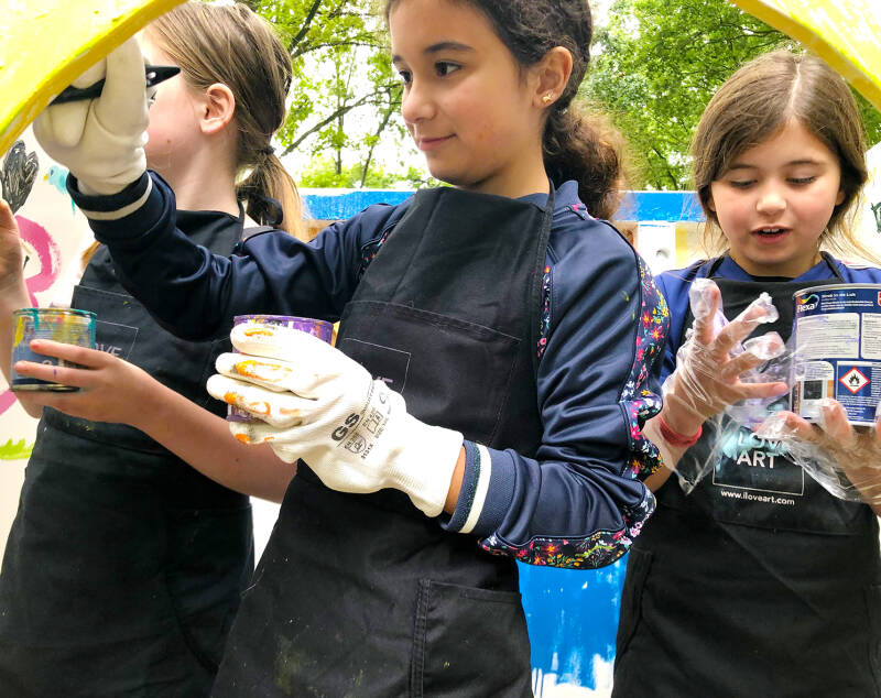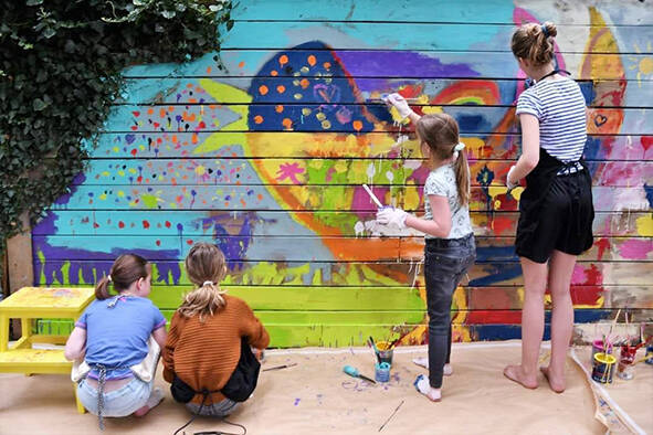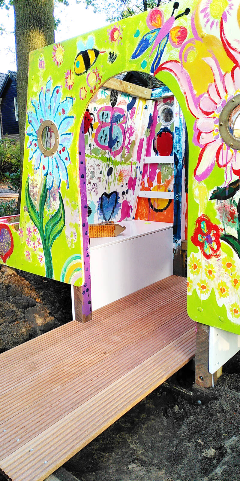 Het Kinderboekenhotel Tielekeshoeven hebben we met 60-70 buurtgenoten van alle leeftijden gemaakt en beschilderd.