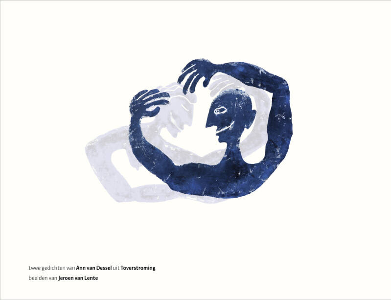 Zonder haar te kennen maakte ik in 2011 een illustratie bij het gedicht Zegt een colaflesje van Ann van Dessel. Ze staan samen in het boek Vijf draken verslagen, Querido's Poëziespektakel 4. Ik kreeg de eervolle opdracht een illustratie te maken bij een van de zes gedichten die ik vond op de dubbele pagina die ik kreeg toegestuurd door Ted van Lieshout, die de bundel samenstelde. Later, benieuwd naar wie nou eigenlijk Ann van Dessel was, zocht ik contact met haar. Dat groeide uit tot een vriendschap en toen ze in 2017 aankondigde dat er een nieuwe bundel aan zat te komen riep ik meteen: daar wil ik wat mee! Nadat Ann lang had zitten schuren en schaven stuurde ze mij het uiteindelijke manuscript toe. Ik printte het uit en begon te lezen. Bij diverse gedichten maakte ik potloodschetsjes om die later te gebruiken voor een definitieve uitvoering. Het gedicht tussen huid en uit verwoordde voor mij de moeizame communicatie tussen mensen en de angst om je te verbinden. De moeite tot verbinding uit zich er in dat het twee losse figuren zijn geworden, die echter wel in de houding staan om nader tot elkaar te komen en elkaar warmte te geven. De wens is er dus wel. De rode man en vrouw hebben elkaar toch gevonden, ook al is er veel voorzichtigheid.