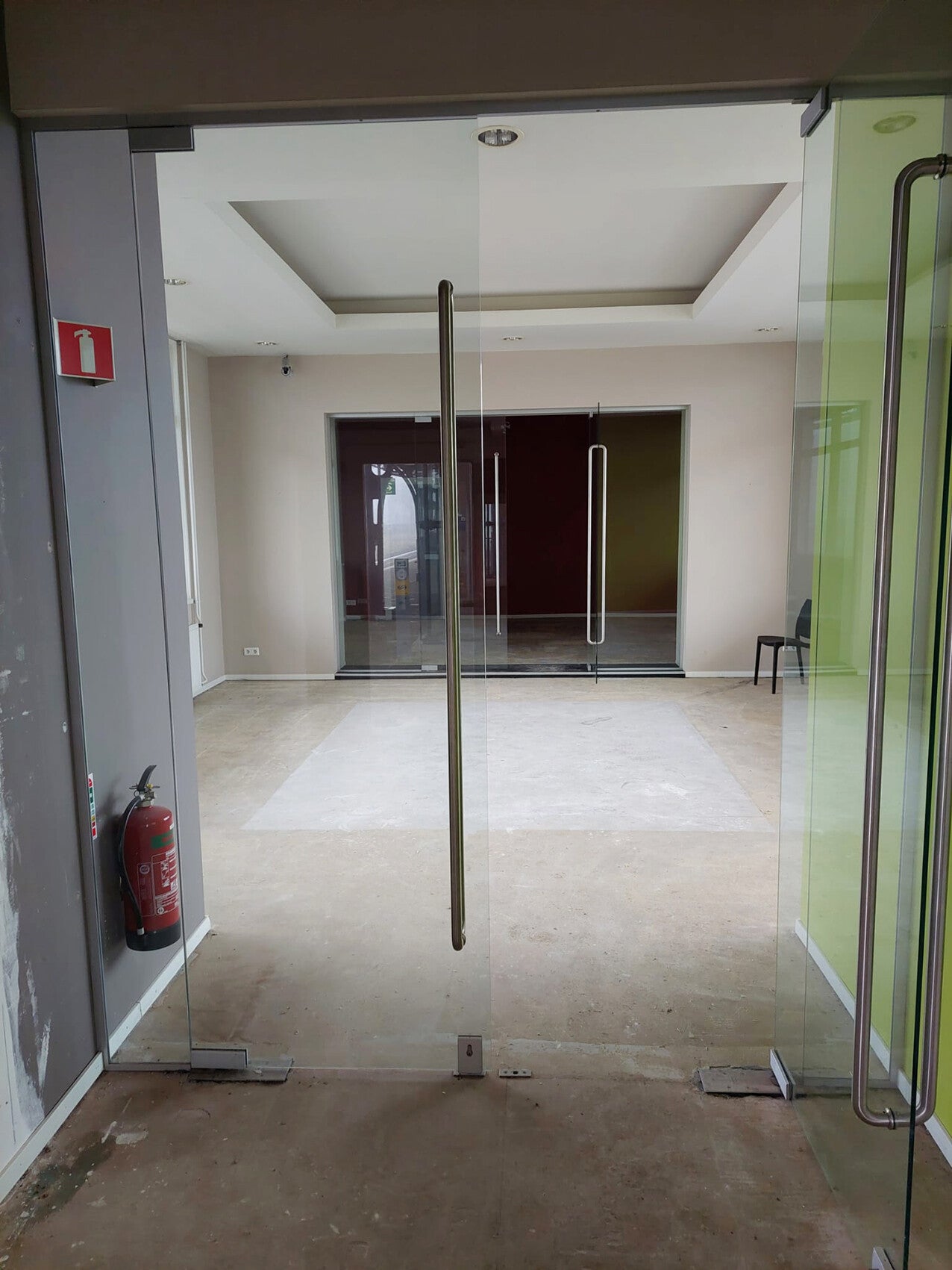 - Achter deze ruimte is nog een ruimte (ook met glazen deuren) met dichte muren. Deze ruimte is ook ongeveer 25m2.