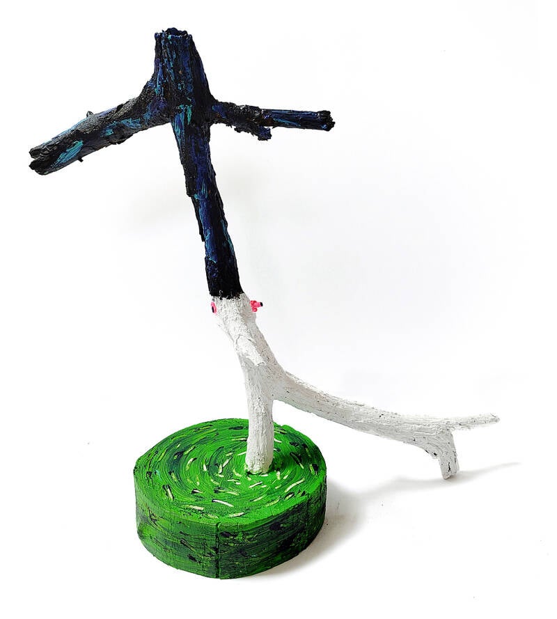 - wortel en tak, beschilderd met acrylverf, verkoperd ijzer